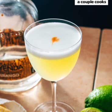 The mezcal sour is a spin on the classic sour cocktail! It’s smoky and sweet tart, starring lime, Cointreau, and a foamy topping.