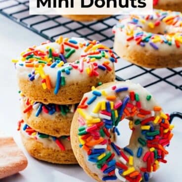 Looking for a festive treat? Look no further than these baked Mini Donuts! These sweet little rings are moist and cinnamon scented, like a cake donut but baked up in the oven. Top them with a glaze and shower of sprinkles, and what could be more fun? It’s the perfect treat for birthdays and celebrations. We made these for our son’s donut themed birthday party, and they were a huge hit! Here’s how it’s done.