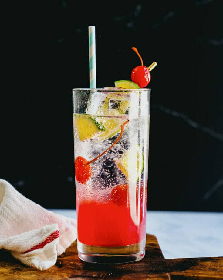 Here’s a bright, beautiful mocktail: the Cherry Lime Rickey! Something about the combination of cherries and lime is pure genius, where the tart of the citrus perfectly accentuates the sweet berry. So combining it into a homemade mocktail or cocktail? Well, it’s pretty darn perfect. Here you’ll take a lime rickey mocktail and add a cherry syrup to bring in that candy-colored flavor. (You can also add gin for the alcohol drinkers!)
