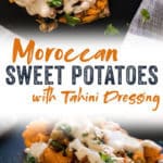 The specific one-dish balanced meal we chose to taste? This healthy baked sweet potato recipe with Moroccan lentils! And my, is this vegan lentil recipe exceptional! The sweet potatoes are baked until moist and tender. Then they’re layered with lentils that are mixed with Moroccan flavors: cumin seeds, cinnamon paprika and harissa, and veggies. To top it all off: a creamy lemon tahini sauce brings it all together. The vibrant sweet potatoes against the savory spiced lentils are the perfect match: drop-dead delicious! Alex and I loved this new take on one of our favorite vegetables.