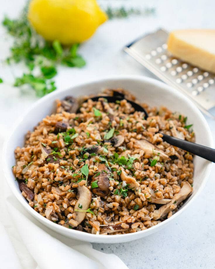Here's a tasty way to make a mushrooms into a side dish recipe: farro with mushrooms! It's bursting with flavor from the savory mushrooms, garlic, and fresh thyme and oregano. Add a spritz of fresh lemon juice and some grated Parmesan cheese and it's pretty heavenly.