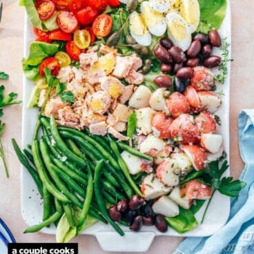 Nicoise salad (Salade Niçoise in French) is a composed French salad served as a main dish, featuring tuna, potatoes, blanched green beans, olives, tomatoes, hard boiled eggs, a vinaigrette salad dressing. In French, it means “salad from Nice, France” and it’s a classic dish from the Southern coast. Because it’s packed with protein, it’s filling and incredibly satisfying.
