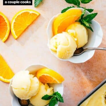 Here’s a fun, nostalgic recipe that’s 100% more delicious to make homemade: Orange Sherbet! This creamy, citrusy puree is frosty and pure, with none of the sickly sweet or artificial flavor the purchased variety can have. Its zesty Creamsicle flavor tastes like so much more than the sum of its parts: and yet it’s beyond simple to make at home. Homemade sherbet has become our favorite frosty dessert to whip up. Here’s how to make orange sherbet!