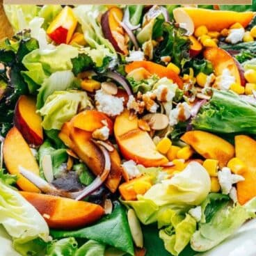 If a salad can taste as satisfying as a dessert, this one is it! It stars juicy, ripe peaches and a sweet balsamic vinaigrette, with creamy goat cheese, nutty toasted almonds, and pops of sweet corn.
