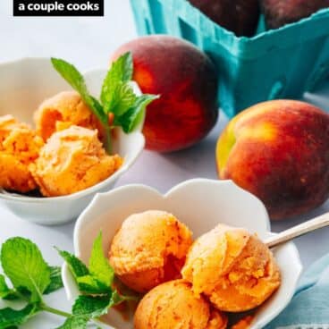 This frosty dessert accentuates the gentle sweetness of peaches simply with sugar and a pop of lemon juice. It’s a nice refreshing alternative to peach ice cream (and naturally vegan). But most of all: it’s darn delicious! We hope you love it as much as we do.