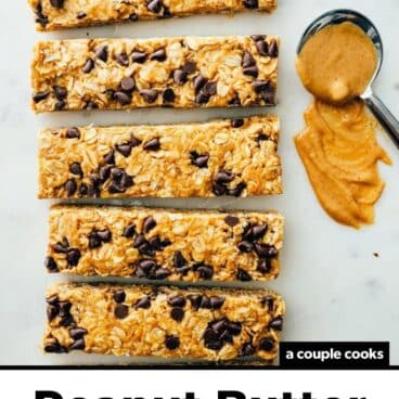 Love peanut butter? Here’s the ultimate snack for PB lovers: Peanut Butter Granola Bars! Storebought granola bars are convenient, yes. But they taste sugary sweet and one note, with a a slightly artificial aftertaste. The flavor difference versus a homemade granola bar? It’s transcendental: honey sweet, nutty, nuanced with a hint cinnamon and a pop of rich chocolate. We think you’ll agree: these are amazing. Make up a batch and eat off of them for treats and healthy snacks all week long.