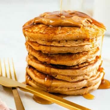 Adding nut butter is a tip I learned with my eggless pancakes, and I figured even more PB couldn’t hurt. This pancake recipe is ultra fluffy, and when it’s topped with bananas, maple syrup, and another slather of peanut butter, it’s pretty heavenly.
