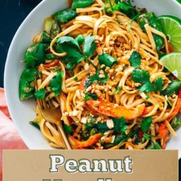 Need dinnertime inspiration? Cozy up to a bowl of these creamy, zingy peanut noodles! This is one of our favorite fresh, easy dinner recipes and it comes together in less than 30 minutes. The peanut butter sauce is lusciously creamy, bursting with flavor from soy sauce, fresh lime juice and honey or maple syrup. Mix it together with luscious noodle strands and crunchy veggies and top with loads of fresh cilantro and crunchy peanuts. You’ll never want the bowl to end!