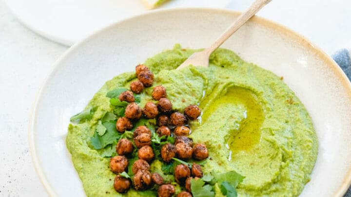 This green hummus is bright and flavorful healthy snack, featuring spinach, cilantro and lime. Snacking just got more fun!