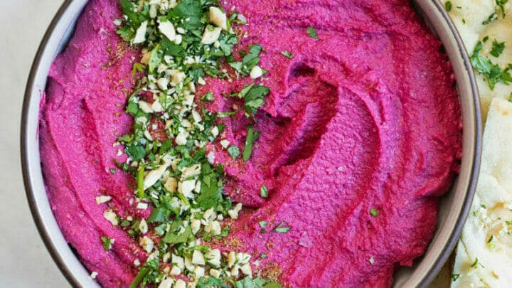 This shocking pink beet hummus is a colorful healthy snack recipe! Serve it with veggie sticks and pita bread for dipping.