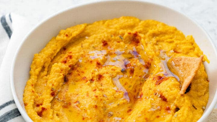This easy pumpkin hummus takes only 10 minutes to whip up! It's creamy and savory with just the right pumpkin undertone.