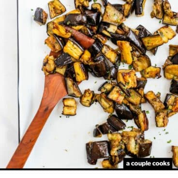 The best way to cook eggplant? Try this roasted eggplant! Take one bite and you’ll be singing its praises: it’s silky and tender, seasoned simply with garlic and basil. Serve it as an easy side dish, or toss it with pasta for a tasty dinner. It transforms into this Roasted Eggplant Pasta in a flash. This method works for diced eggplant or eggplant cut into large slices. It turns out so tasty, we’ve been making it on repeat for years. Ready to roast?