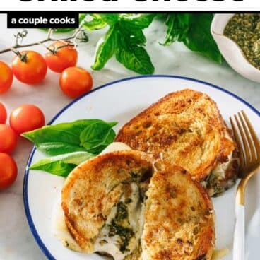 It’s the time of year when our basil plant is big and bushy, and that means all things pesto. Here’s one of our favorite ways to use this herbaceous spread: in pesto grilled cheese! It gives the best garlicky, herby flavor to the gooey melty cheese, making it one irresistible sandwich. It’s quick to put together and almost impossible to put down.