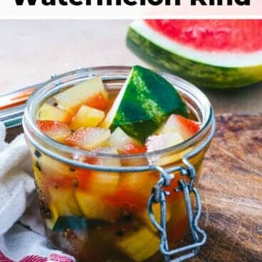 Nothing says summer more than watermelon pickles! These delicious zingy orbs are bright and beautiful, a rainbow of red flesh fading into the yellowed rind. Take one bite and the tangy flavor with a hint of clove and coriander will have you immediately reaching for another. This pickled watermelon rind recipe is the ideal summer preserving project: a great way to reduce food waste after making smoothies, juice, or watermelon salad!