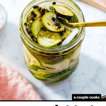 This pickled zucchini recipe makes quick pickles, also known as refrigerator pickles, so there’s no special canning equipment required! Quick pickles are marinated in a mixture of vinegar, salt, sugar, and water and cured in the refrigerator. They’re not shelf stable like canned pickles; instead, you can store quick pickles refrigerated, where they can last for up to 1 month.