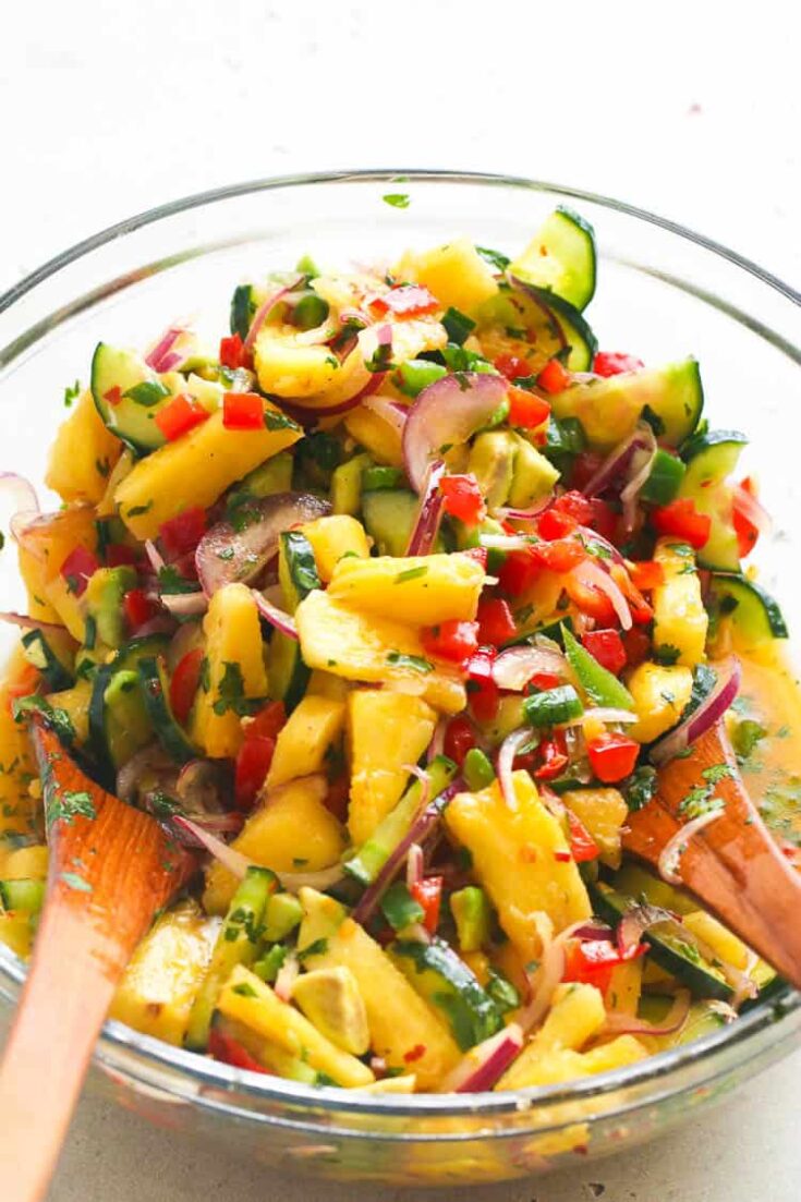 Pineapple salad doesn't have to be made with pretzels (Google it: it's a thing!). This refreshing side dish is ideal for a cheery backyard party or a quick lunch or side! Starring fresh pineapple, cucumber, red bell pepper, and cilantro, it's covered in an explosively flavorful dressing. via Immaculate Bites