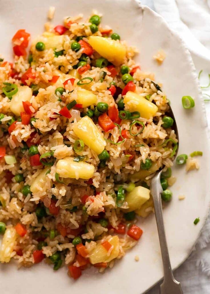 Pineapple is perfect in this Thai-style fried rice. The sweet, juicy pieces of fruit goes so well with the savory jasmine rice! It's a great side dish for summer BBQ’s and Thai-style meals. via RecipeTin Eats