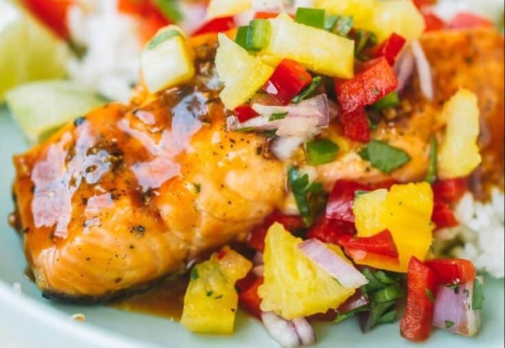 Pineapple goes perfectly with seafood! This juicy, grilled pineapple salmon is brushed with a mouthwatering sweet and savory pineapple glaze and topped with a fresh pineapple salsa that gives all the tropical vibes. via The College Housewife