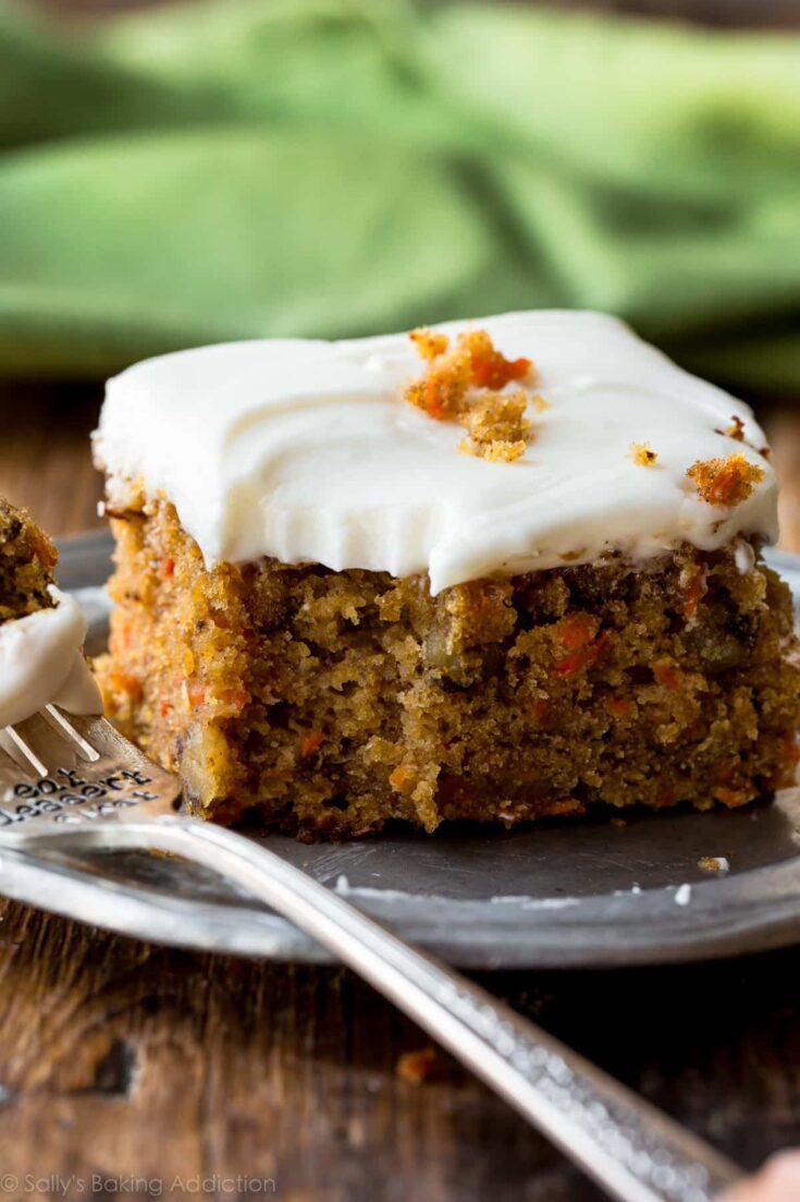 Canned crushed pineapple is often a component of carrot cake: and this one is sublime! This pineapple carrot cake is incredibly moist, full of spice flavor, and topped with smooth tangy cream cheese frosting. This simple from-scratch recipe comes together quickly and easily. via Sally's Baking Addiction
