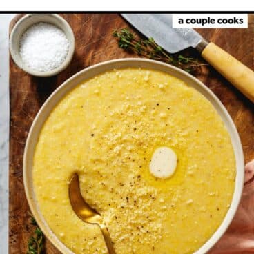 It’s easy to make this into a vegan polenta recipe! Simply use vegan butter in place of the salted butter, and add additional salt to taste. Omit the Parmesan cheese, or there are several brands of dairy-free Parmesan cheese on the market that would work well as a substitute.