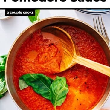 Here’s an Italian staple recipe that every home cook should know: Pomodoro Sauce! This classic Italian sauce is pure in its simplicity: simmering tomatoes and a few aromatic vegetables make a straightforward yet nuanced flavor. It takes a little time to simmer, but it’s well worth it for the ease of this recipe: and the bold flavor! We were pleasantly surprised at how beautiful the flavor is here: sophisticated in a way jarred sauce is not. Here are all our tricks to a killer pomodoro sauce!