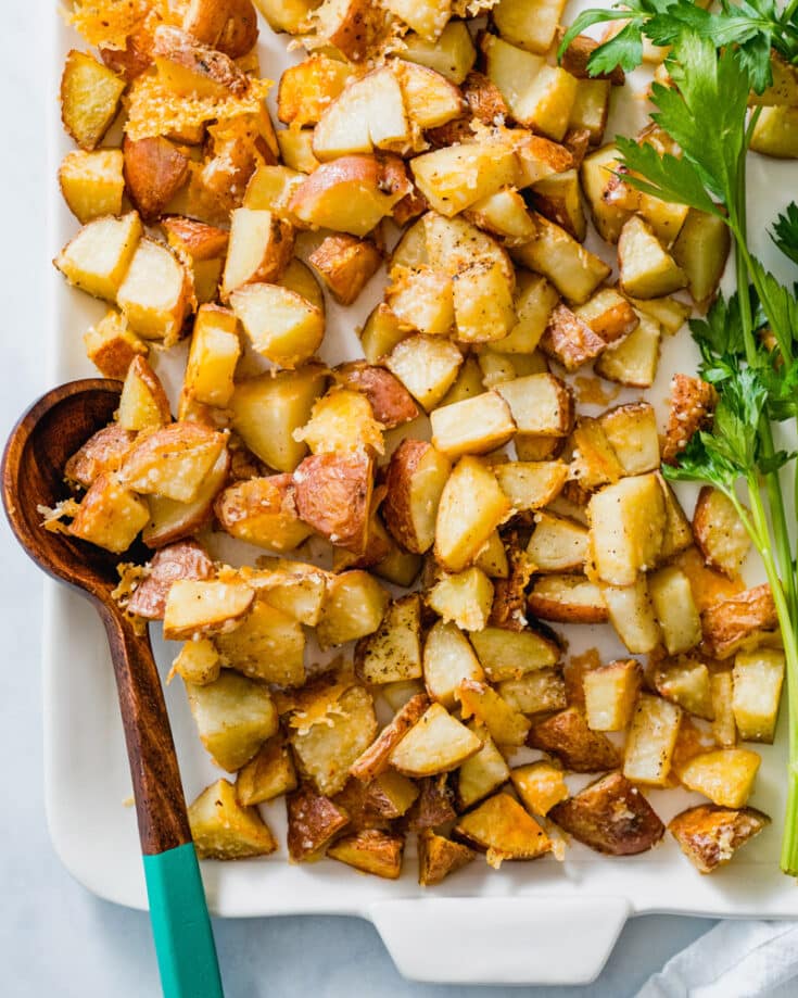 Here’s a simple side dish that’s always satisfying: Roasted Red Potatoes! These spuds come out crispy and savory, seasoned with garlic powder and salt. A bit of Parmesan cheese gives them even crispier roasty bits. Bake up a sheet pan of these little spuds, and each bite is a little bit of heaven! These disappeared in an instant over here.