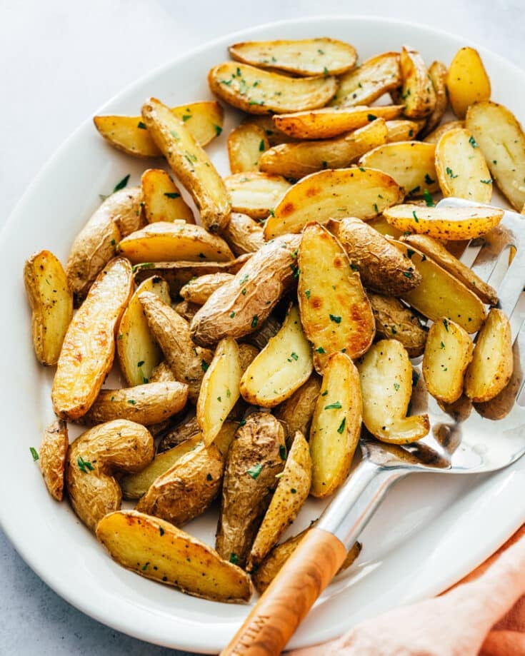 There’s nothing like fingerling potatoes! These finger-like slender potatoes have a buttery texture that’s unlike any other spud around! Roast them up until they’re crispy on the outside and tender on the inside, and warm from the oven they’re an absolute delight. Toss them with a little minced garlic and parsley until your kitchen is bathed in a warm, garlicky fragrance.