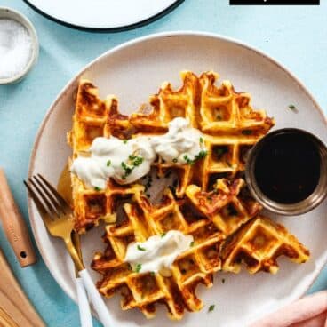Want a fun way to make a savory breakfast: try Potato Waffles! These crispy waffles are to-die-for, with a crispy exterior and a fluffy, cheesy interior. They taste like a combination of a hashbrown and a waffle, and wow are they delicious. Serve them up savory with sour cream and chives (or as chicken and waffles). Or, they work just as well served sweet with maple syrup! They’re the perfect idea for using up leftover mashed potatoes from Thanksgiving or any meal.