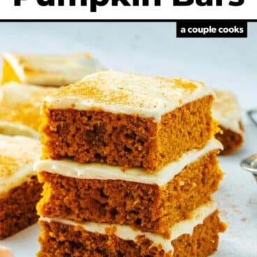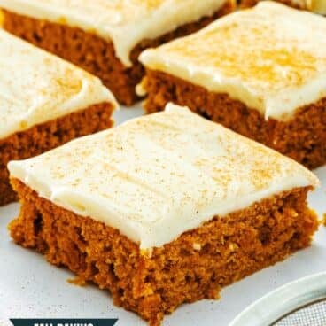 These pumpkin bars with cream cheese frosting are a fall favorite! The soft and cakey bars are packed with pumpkin spice flavor and finished with a lusciously creamy frosting. Every time we serve them, someone asks for the recipe!