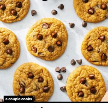 Can’t choose between traditional chocolate chip cookies and pumpkin cookies? You don’t have to with these Pumpkin Chocolate Chip Cookies! These sweet morsels are an ode to fall: chewy and spiced, they feature cinnamon, ginger, cloves and nutmeg with a traditional chocolate chip cookie base. Even better: they’ve got just the right texture: no cakey cookies here. Whip up a batch and your kitchen will smell like an autumn paradise.