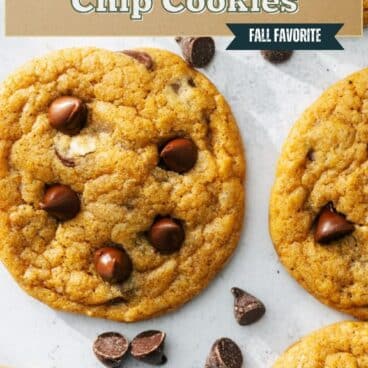These pumpkin chocolate chip cookies are tender, chewy and spiced! Try this tasty fall spin on the classic treat.