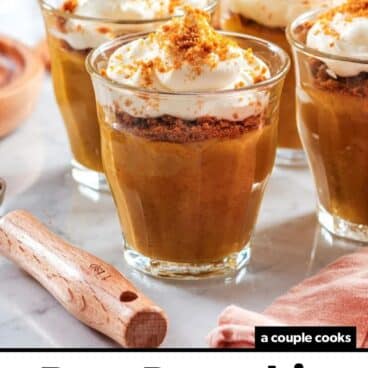 Here’s a fun treat for the season: try this pumpkin pudding! The sweet custard is made like a traditional homemade pudding, with added pumpkin puree and cozy spices. To serve, add crushed gingersnaps or graham crackers and top with whipped cream! It’s like pumpkin pie filling in a glass: but a mini version with all the fun and none of the fuss. Here’s how to make it!