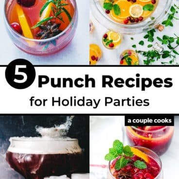 Last up, Holiday Punch! This punch recipe is great for the holidays, but you can use it for any fall or winter occasion. The flavor is fruity and delicious, with a little sparkle from ginger ale. Make it with rum for a punch with alcohol, or omit it for non alcoholic. Either way, it tastes incredible! The best part? Garnish it up with sliced citrus, rosemary branches and cranberries. It couldn’t be more festive or beautiful.