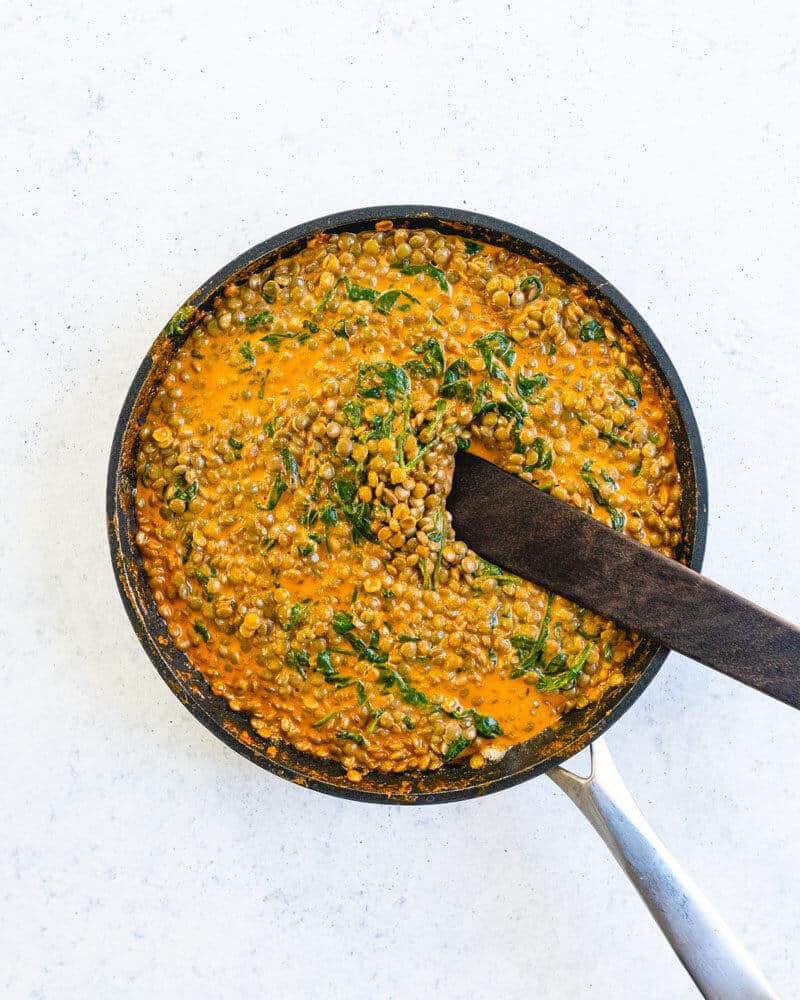 - When the lentils are done, add them to the skillet with the greens. Over medium high heat, stir in the coconut milk, Thai red curry paste, tomato paste, kosher salt, and fresh ground black pepper. Cook for a few minutes until heated through and the sauce is thickened.