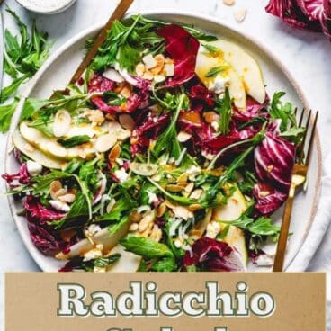 Move over kale: there’s a new salad green in town (or, a new purple?). As cookbook authors who’ve made over 60 salad recipes, it’s hard to impress us with something new. But this radicchio salad is a vibrant explosion of flavors and textures that will send your tastebuds into overdrive! Bitter bright purple radicchio leaves are balanced by the sweetness of ripe pears, the satisfying crunch of toasted almonds, the creamy tang of goat cheese, and a zesty citrus vinaigrette that ties it all together. This isn’t your average salad!