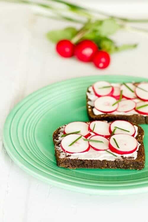 One of the simplest radish recipes? Radish toast! Here's what to do: spread a piece of toast with cream cheese or labneh (yogurt cheese you can make at home). Top the toast with sliced radishes, chopped chives and a sprinkle of sea salt. It's so easy and works for lunch or a spring brunch.