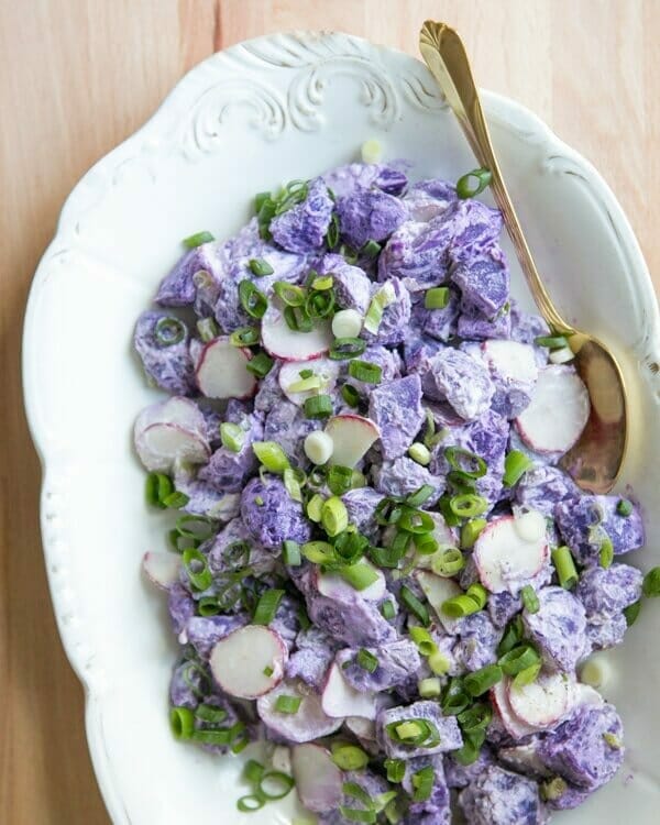 Last but not least in our radish recipes: this purple potato salad! Thinly sliced radishes add big flavor to creamy salads like potato salad and egg salad. Here they provide the perfect color contrast to purple potatoes! These vibrant veggies are becoming easier to find in mainstream grocery stores: or look for them at your local farmers market. Or, just throw radishes into your favorite potato salad recipe! This No Mayo Potato Salad is ours.