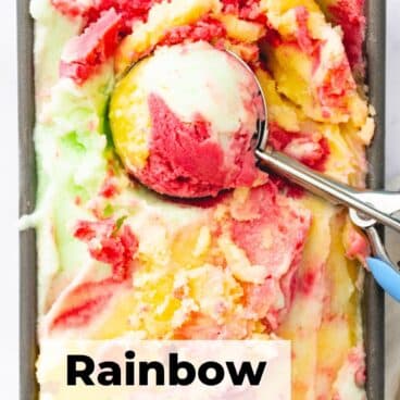 Rainbow sherbet is a colorful and fun frozen treat! The classic combination of orange, lime and raspberry is fruity and refreshing.