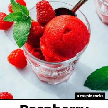 There’s something about bright red raspberries that endear us when it comes to frozen treats, and this one is no exception. Try this homemade Raspberry Sorbet recipe! The flavor is an explosion of pure fruit, like taking a bite of 100 raspberries at once. It’s got the best creamy, frosty texture, like a good raspberry gelato. Better yet: it’s simple to whip up at home and impresses everyone. This one in particular is a big favorite around here, vying for the top spot against Strawberry Sorbet. Ready to give it a try?
