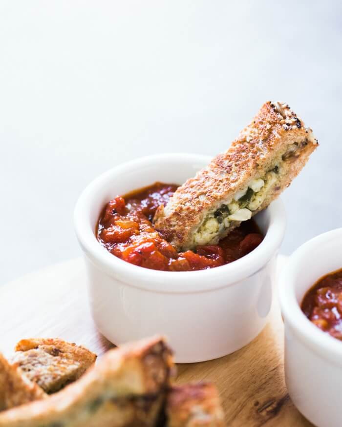 Another recipe with pesto: turn that pesto grilled cheese into "dippers"! Slicing the sandwich into long strips makes them perfect for dipping. Here you'll dip it into a tangy marinara sauce. It makes for the perfect gameday or entertaining appetizer, or it works as a snack too.