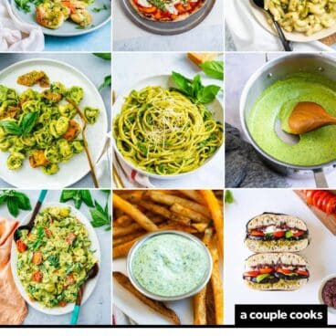 Before we get to the end of these recipes with pesto...let's talk vegan pesto! Do you eat a plant based diet? That emerald green, classic sauce is traditionally made with Parmesan cheese. But don't worry: vegan pesto is darn good, too! Head over to see our secret to getting that cheesy flavor. Or, try our Vegan Cashew Pesto, which features cashews instead of the traditional pinenuts (they're easier to find and cheaper).