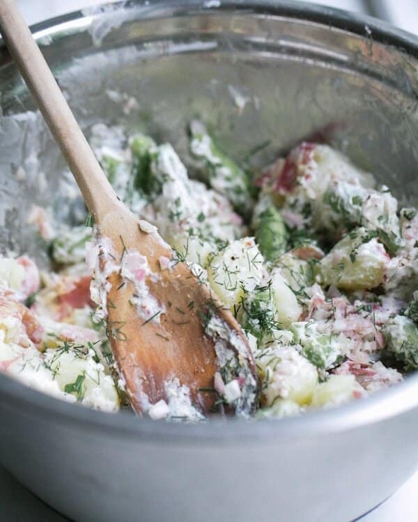 And now for a more traditional potato salad in our red potato recipes! This one is an herby red potato salad with a creamy Greek yogurt sauce, mixed with fresh dill and rosemary. It’s also filled with fresh green snap peas! The salad is simple, delicious, and still incredibly tasty after several days in the refrigerator. It’s a great way to use any fresh herbs you have on hand.