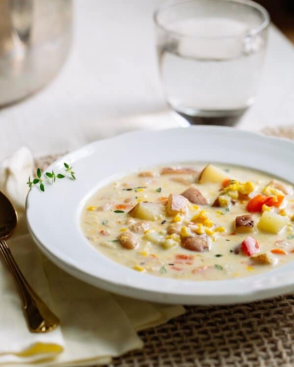 One of our favorite red potato recipes is this delicious potato corn chowder. White beans blend in with the other vegetables, at the same time adding some plant based protein and making the soup more filling. It’s a fantastic potato corn chowder that’s bursting with flavor and not too heavy.