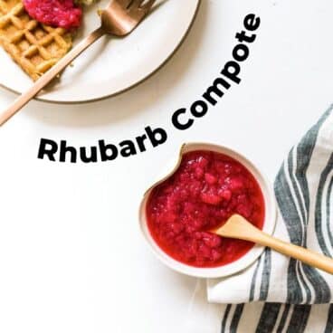 From there, you can use the rhubarb compote on anything you like! It’s pretty sweet, so a little of the stuff goes a long way. We served it over these fluffy gluten free waffles, but it would be perfect on pancakes or French toast. Leftover rhubarb compote is perfect to swirl into yogurt, oatmeal, or as a simple dessert, vanilla ice cream. Here’s to the simple, seasonal pleasures: like rhubarb compote in the spring! And aside from the flavor, the vibrant hot pink color can’t be beat.