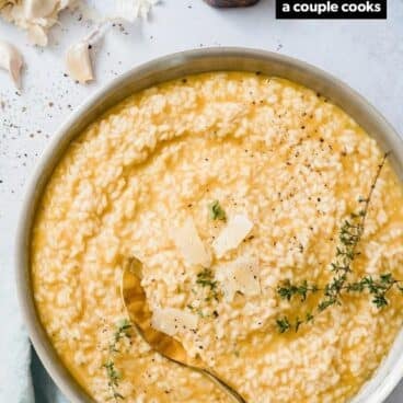There are many variations on a risotto. Use this one as a template and add ingredients like sautéed or roasted vegetables, cooked shrimp, and so forth. This classic risotto recipe is basic as is, so you’ll want to serve it as a side dish with a protein (like roast chicken or a vegetarian main), or add some protein or other ingredients to round it out. Here are a few other risotto recipes and some ideas for additions: