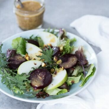 This beet and apple salad features a tangy honey mustard dressing, tart green apples, mixed greens, and chopped pistachios.