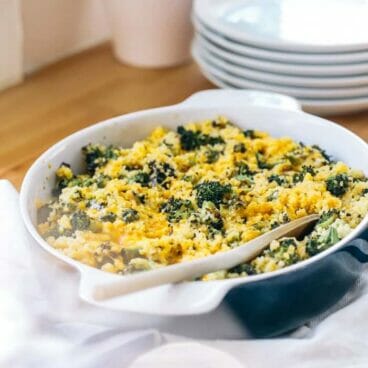 This cheesy broccoli casserole is a cozy comfort food with a healthy spin! It features whole grain millet and roasted broccoli.