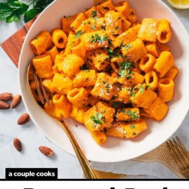 To make this red pepper pasta vegan, use vegan butter in place of the heavy cream: you can use 2 to 4 tablespoons butter. You can also use cashew cream if desired. Then omit the Parmesan cheese or use purchased vegan Parmesan (we’ve found some good brands on the market these days!).