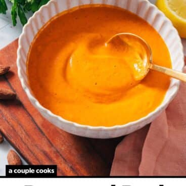 Looking for a flavor-packed sauce that takes just a few minutes to make? This roasted red pepper sauce is full of zingy flavor, no cooking required! Throw a few ingredients into a blender and it makes a bright orange, tangy garlicky sauce. It’s extremely versatile: use it for a pasta sauce, as a dip for vegetables or fries, or as a sauce for fish or chicken. It makes any meal more fun!