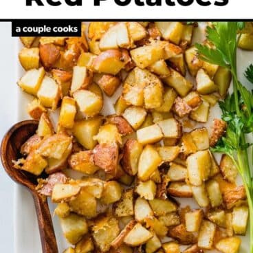 Here’s a simple side dish that’s always satisfying: Roasted Red Potatoes! These spuds come out crispy and savory, seasoned with garlic powder and salt. A bit of Parmesan cheese gives them even crispier roasty bits. Bake up a sheet pan of these little spuds, and each bite is a little bit of heaven! These disappeared in an instant over here. Here’s how to roast red potatoes to perfection.